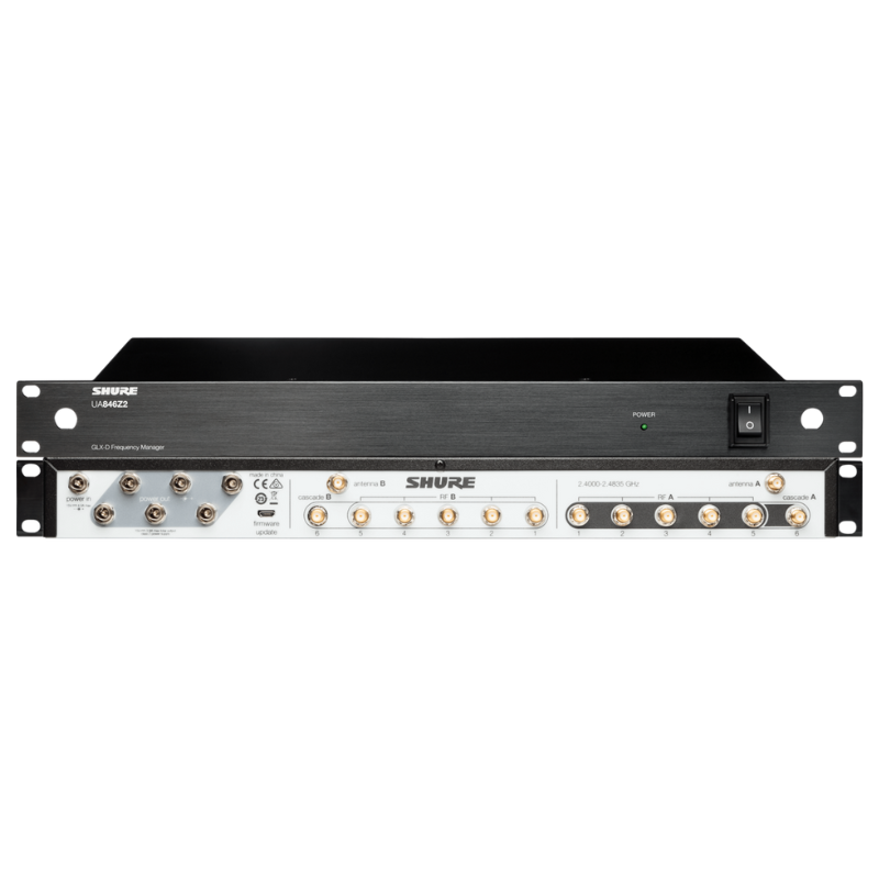 Bộ quản lý tần số Shure UA846Z2 dành cho GLX-D Advanced kết nối tối đa sáu bộ thu GLXD4R, cung cấp hiệu suất RF mạnh mẽ thông qua giao tiếp dữ liệu đã được cấp bằng sáng chế. Có thể tăng số lượng kênh của Hệ thống không dây kỹ thuật số GLX-D Rack Mount lên 9 hệ thống đồng thời trong các môi trường điển hình (11 trong điều kiện tối ưu) với các tùy chọn phân phối ăng-ten linh hoạt cho các ứng dụng đa hệ thống