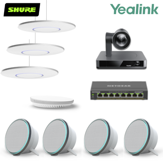 Bộ thiết bị hội nghị LargeY3 là sự kết hợp giữa thiết bị âm thanh Shure (Stem Ceiling, Stem Speaker, Stem Hub) và camera hội nghị chuyên dụng Yealink UVC86 hỗ trợ độ phân giải cao, khả năng quay quét rộng, mang đến trải nghiệm hội họp hoàn hảo cả về hình ảnh lẫn âm thanh. Bộ thiết bị hội nghị được thiết kế cho mô hình phòng họp cỡ lớn hoặc lớp học (20-30 người – >50m2).