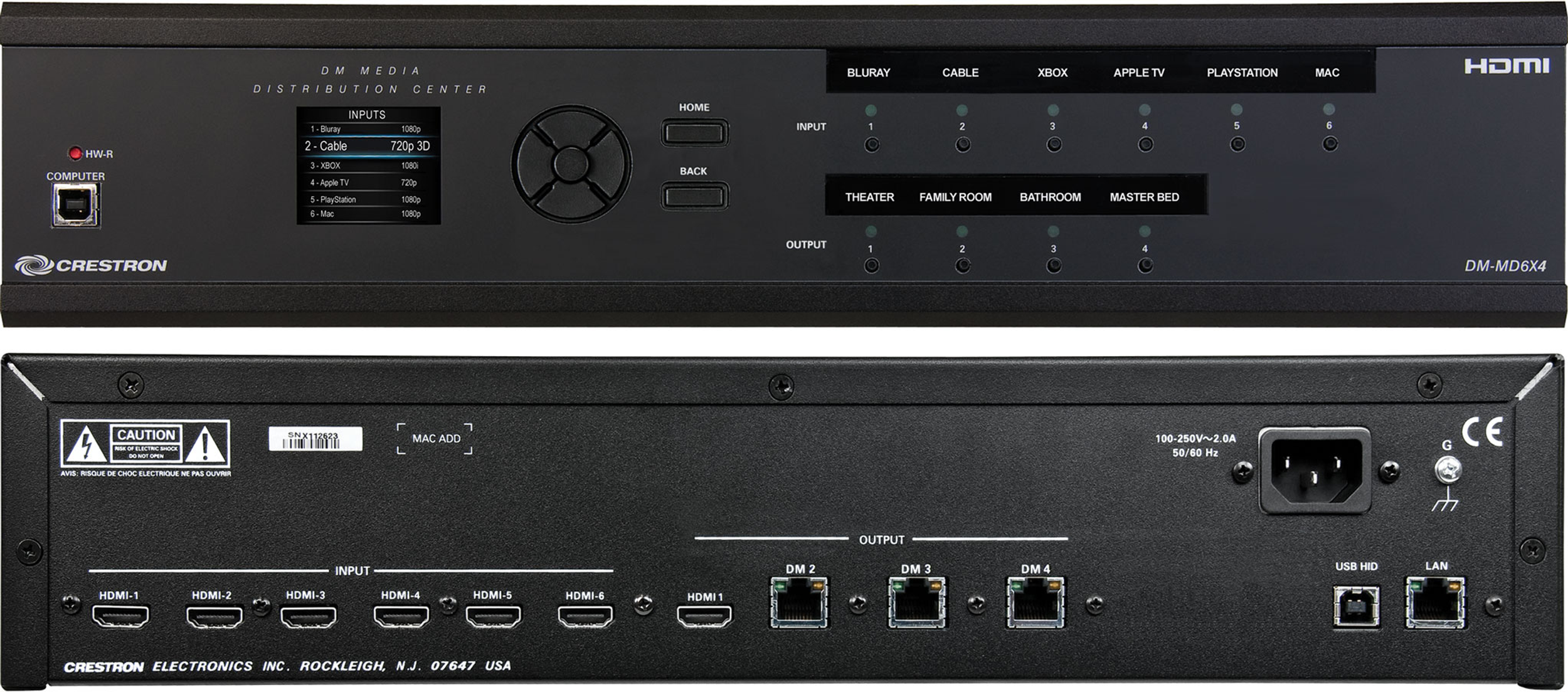 Bộ chuyển đổi DM-MD6X4 cung cấp sáu đầu vào HDMI® để xử lý đầu thu HDTV, đầu đĩa DVD hoặc Blu-ray Disc®, máy chủ đa phương tiện, máy tính và các nguồn kỹ thuật số HD khác. Các đầu ra bao gồm một cổng HDMI và ba cổng DigitalMedia, trang bị kết nối một dây đơn giản cho bộ xử lý âm thanh hoặc màn hình cục bộ và ba màn hình bổ sung ở bất kỳ đâu trong nhà. Chuyển đổi ma trận sáu x bốn cho phép bất kỳ màn hình nào có thể xem bất kỳ nguồn nào vào bất kỳ lúc nào.