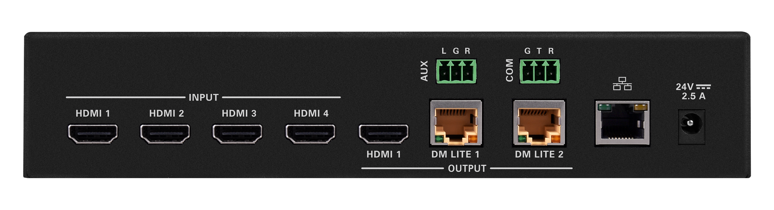 - Bao gồm bốn đầu vào HDMI®, một đầu ra HDMI và DM Lite® được nhân đôi và một đầu ra DM Lite độc lập.
