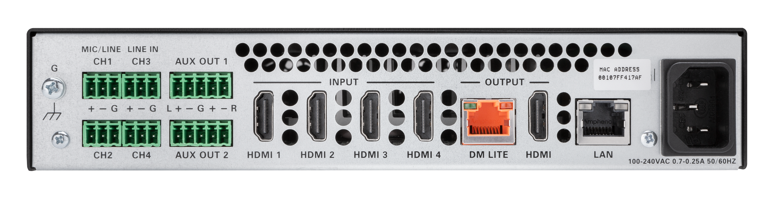 • Cung cấp bốn đầu vào HDMI® và một cặp đầu ra HDMI và DM Lite được nhân đôi với tỷ lệ 4K60, cùng các đầu vào và đầu ra âm thanh tương tự.
