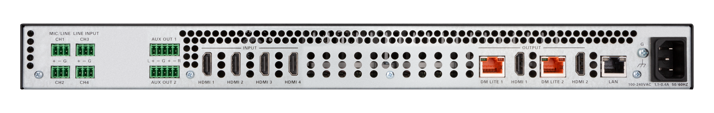 - Cung cấp bốn đầu vào HDMI® và một cặp đầu ra HDMI và DM Lite được nhân đôi với tỷ lệ 4K60, cùng các đầu vào và đầu ra âm thanh tương tự.