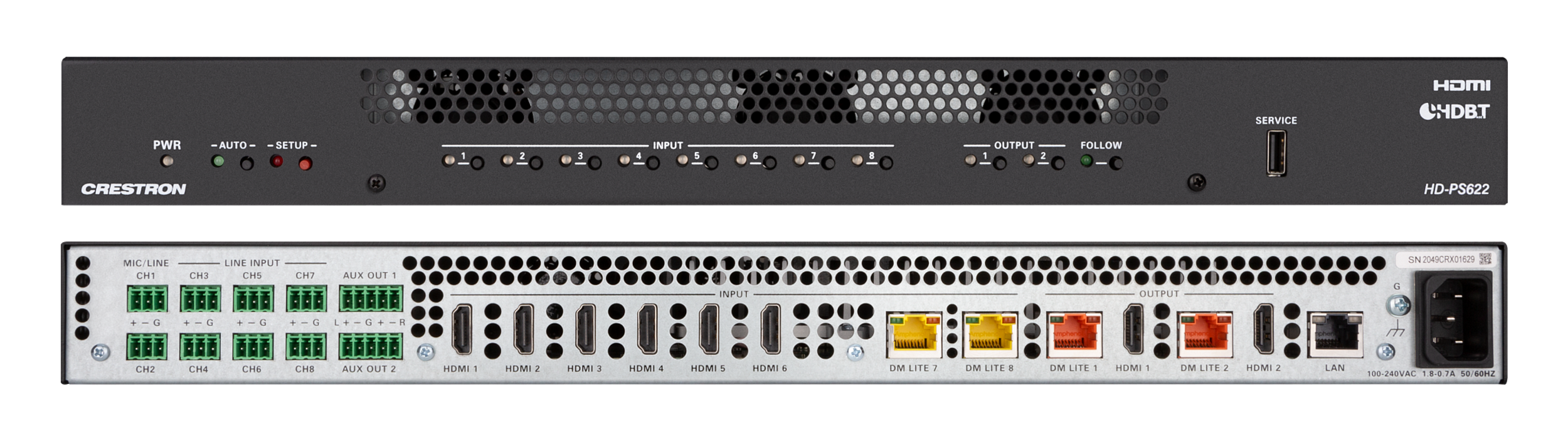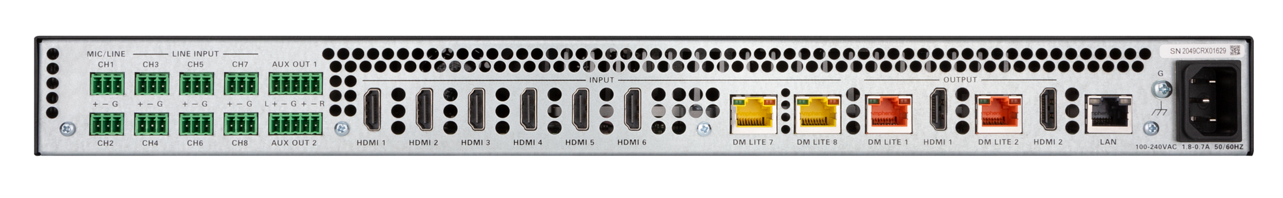 - Cung cấp sáu đầu vào HDMI® và hai đầu vào DM Lite®, một đầu ra HDMI và DM Lite được nhân đôi với tỷ lệ 4K60, cùng các đầu vào và đầu ra âm thanh tương tự.