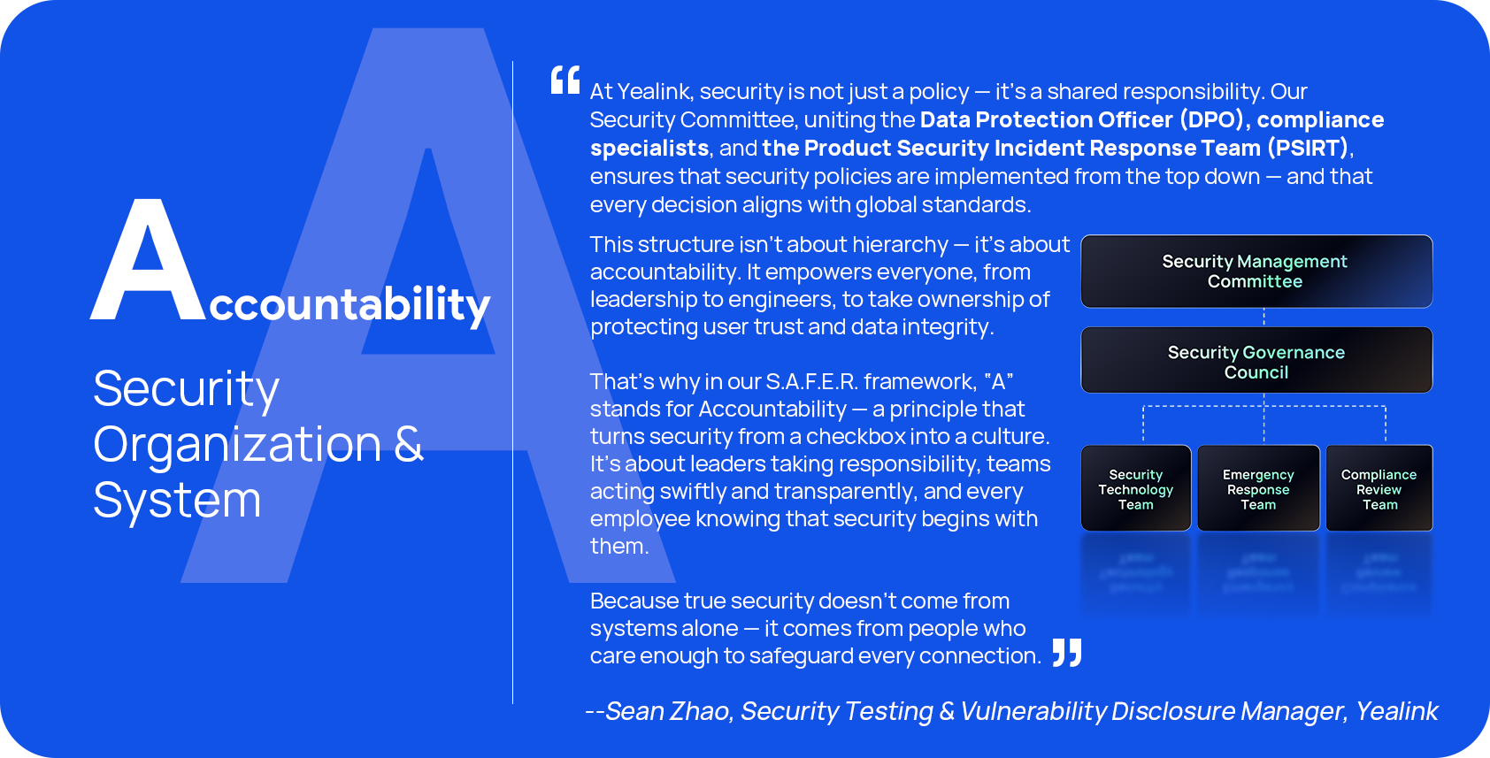 Tại Yealink, những chuyên gia này hợp thành Ủy ban Quản lý Bảo mật (Security Management Committee) — một đội ngũ liên phòng ban bao gồm pháp lý, tuân thủ, R&D và lãnh đạo sản phẩm. Họ cùng chung một mục tiêu: đưa bảo mật trở thành một phần văn hóa doanh nghiệp, chứ không chỉ là một danh mục kiểm tra.