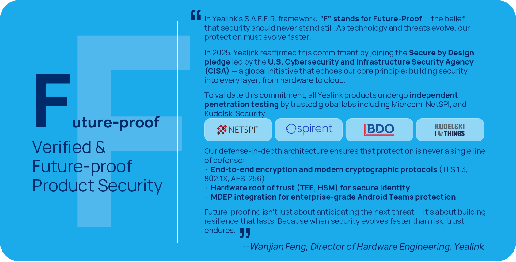 Ông Wanjian Feng, Giám đốc Kỹ thuật Phần cứng, dẫn dắt chiến lược đổi mới “secure-by-design” của Yealink — tích hợp các lớp bảo vệ vào từng tầng kiến trúc sản phẩm, từ nền tảng phần cứng đến hệ thống tổng thể, nhằm chủ động đón đầu và ứng phó với các mối đe dọa ngày càng tinh vi.