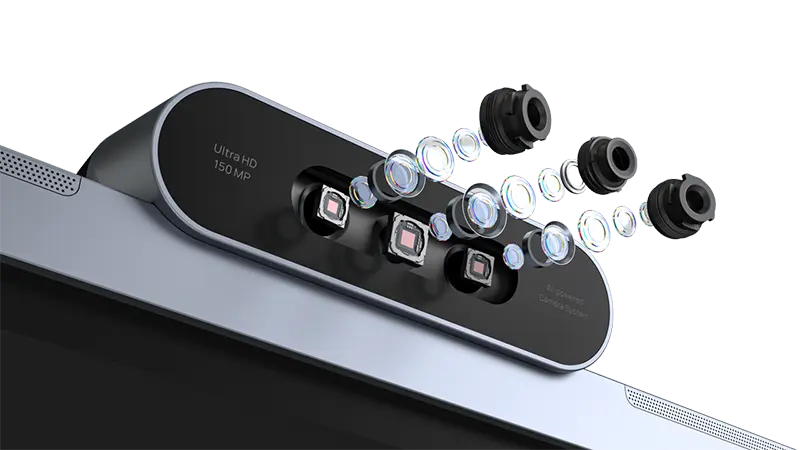 Điểm nổi bật của MeetingBoard Pro là hệ thống camera ba ống kính 50MP, giúp mang lại góc nhìn rộng và hình ảnh cực kỳ chi tiết.