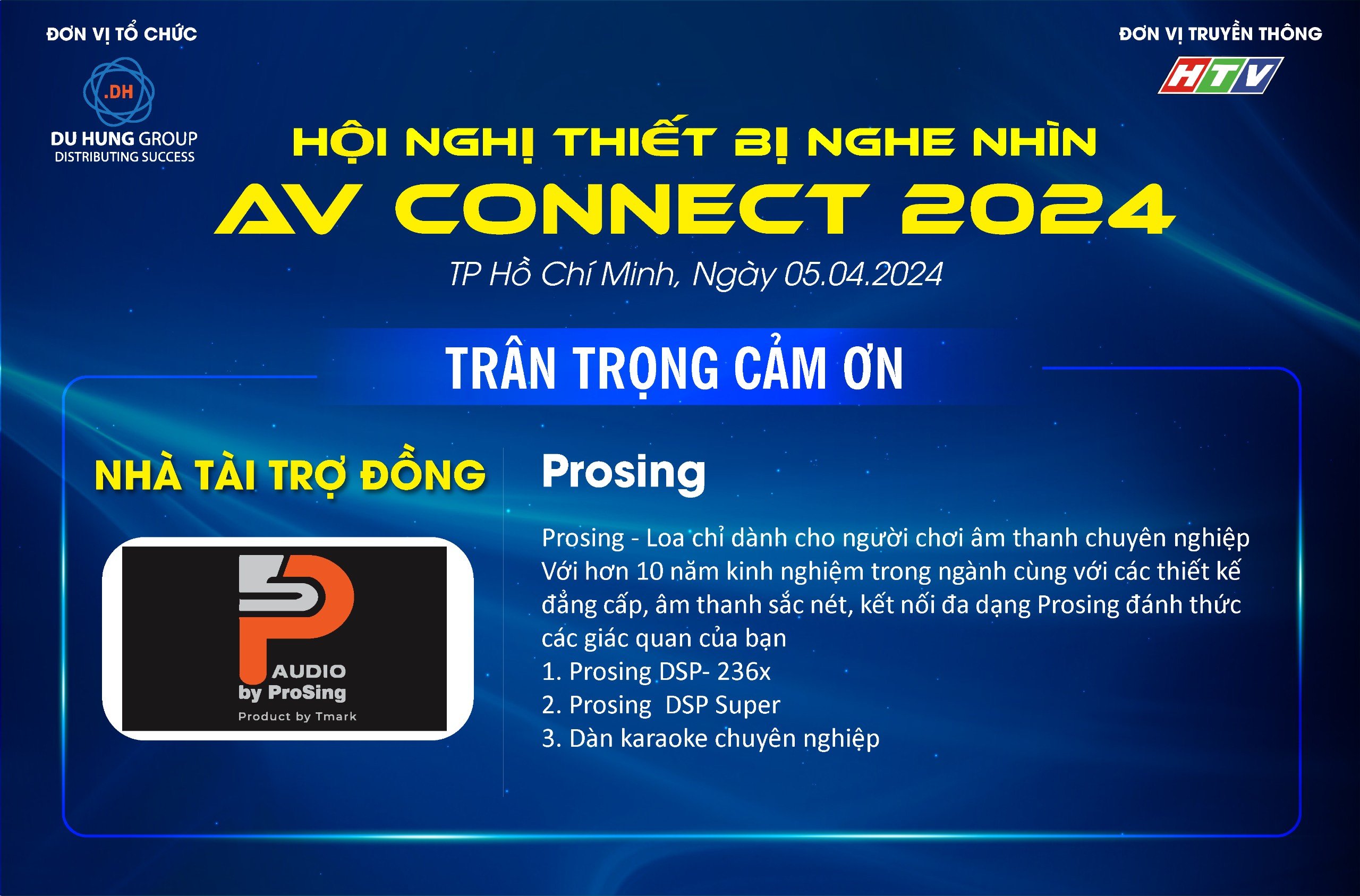Để sự kiện “AV CONNECT 2024 – Hội nghị thiết bị nghe nhìn” được diễn ra quy mô và thành công không thể thiếu sự đồng hành của các nhà tài trợ. Du Hưng rất hân hạnh được đồng hành cùng “Nhà tài trợ Đồng – PROSING