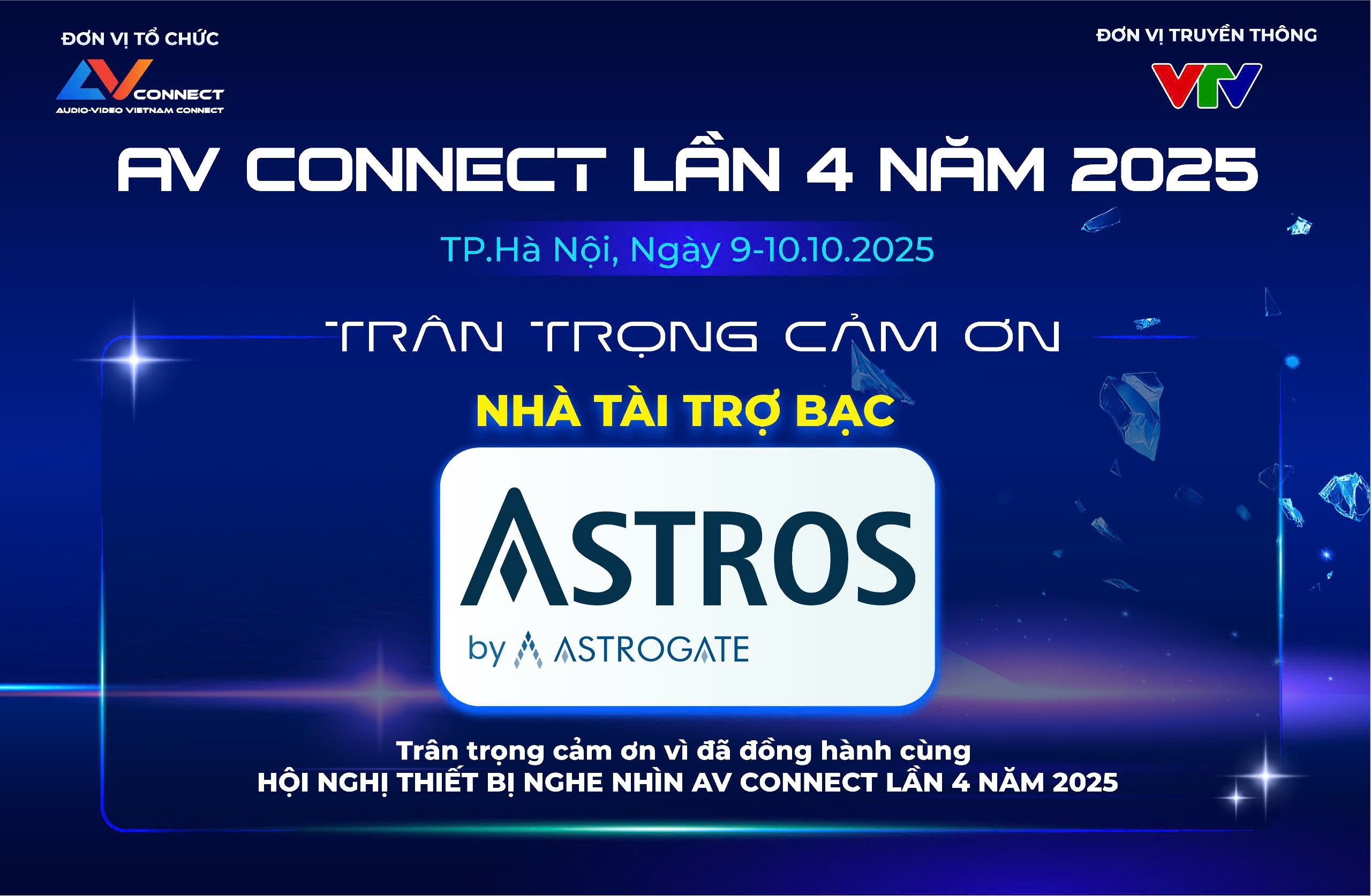 Để sự kiện “Hội nghị thiết bị nghe nhìn AV CONNECT lần 4 năm 2025” được diễn ra quy mô và thành công không thể thiếu sự đồng hành của các đơn vị tài trợ. Ban tổ chức AV CONNECT rất hân hạnh được đồng hành cùng “ASTROS – NHÀ TÀI TRỢ BẠC”.