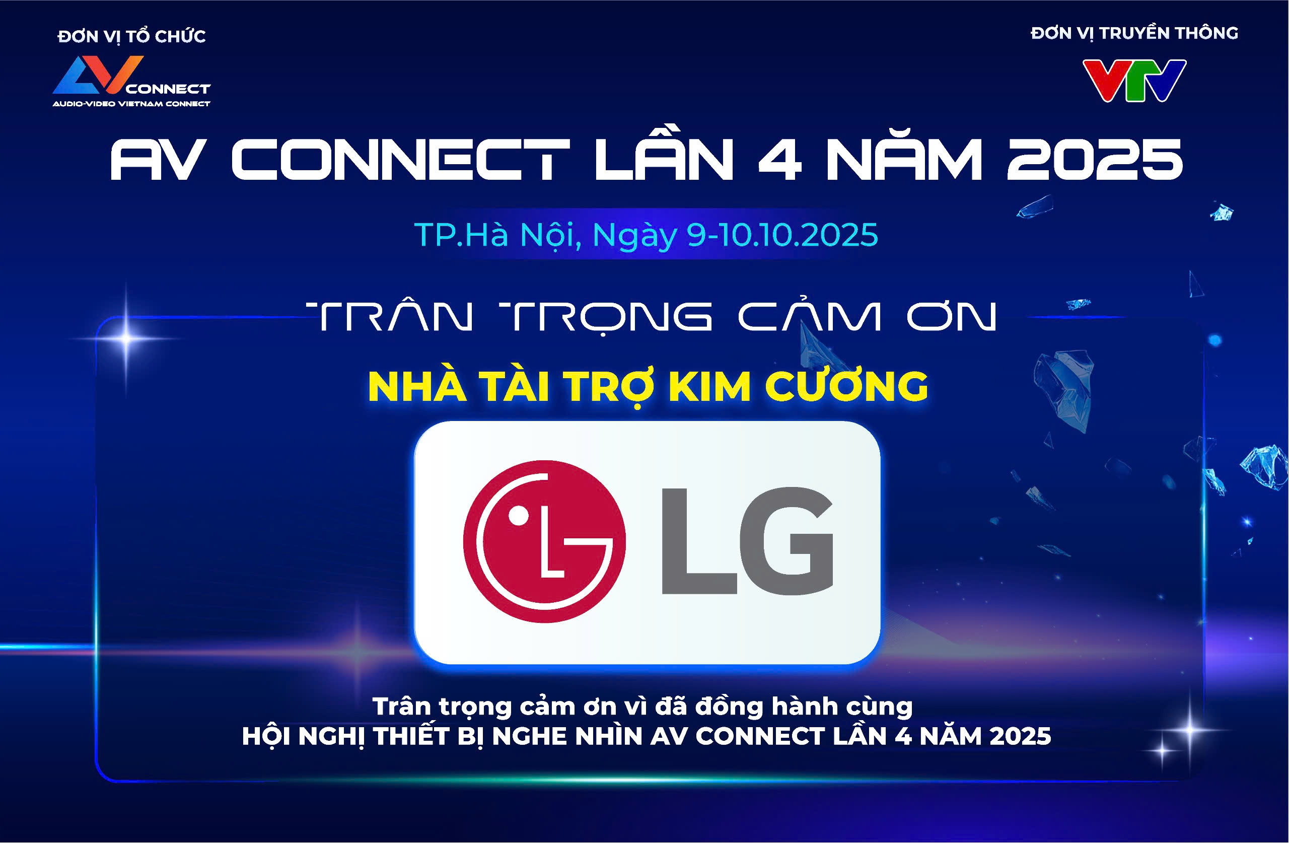 Để sự kiện “Hội nghị thiết bị nghe nhìn AV CONNECT lần 4 năm 2025” được diễn ra quy mô và thành công không thể thiếu sự đồng hành của các đơn vị tài trợ. Ban tổ chức AV CONNECT rất hân hạnh được đồng hành cùng “LG – NHÀ TÀI TRỢ KIM CƯƠNG”.