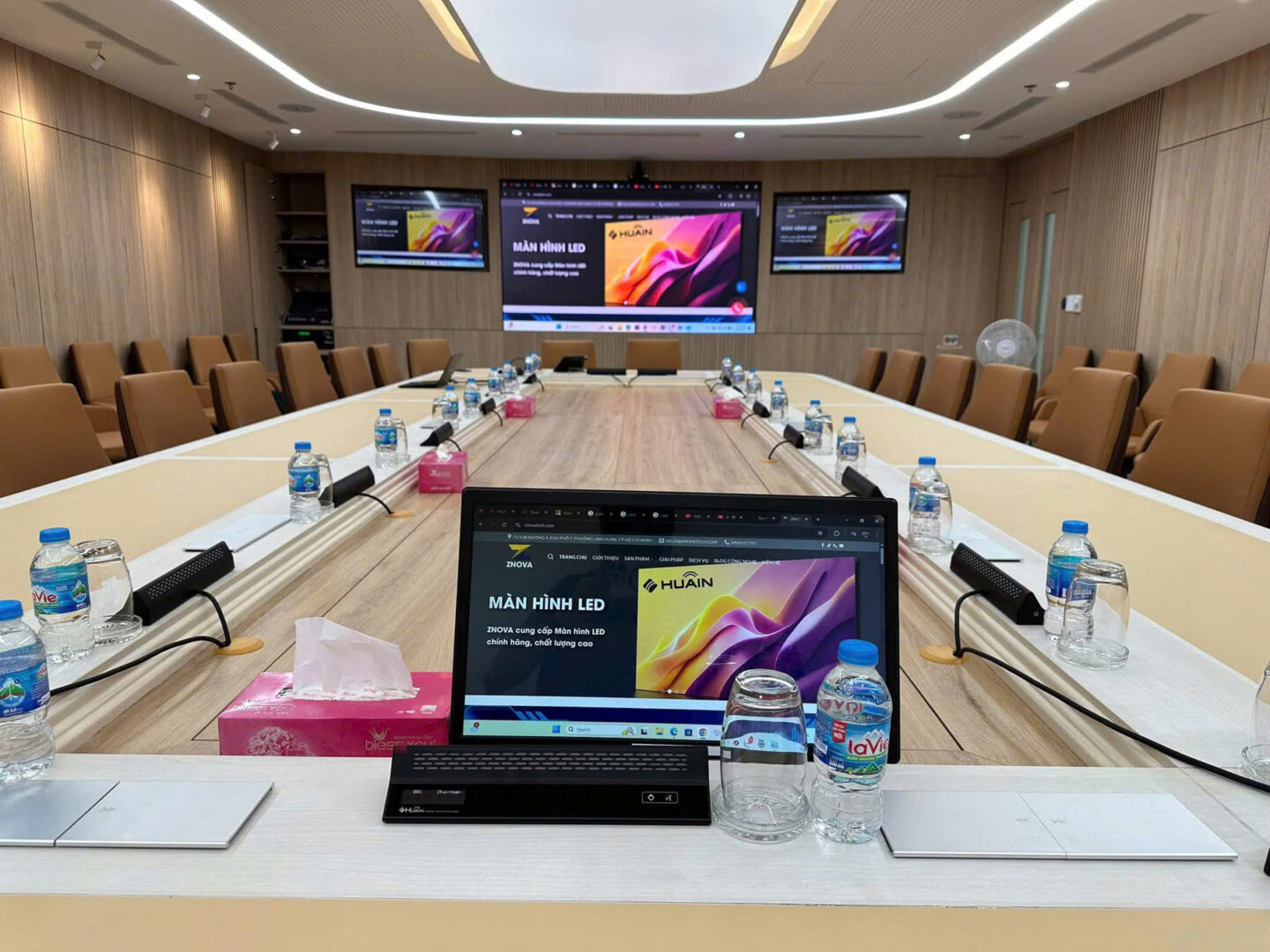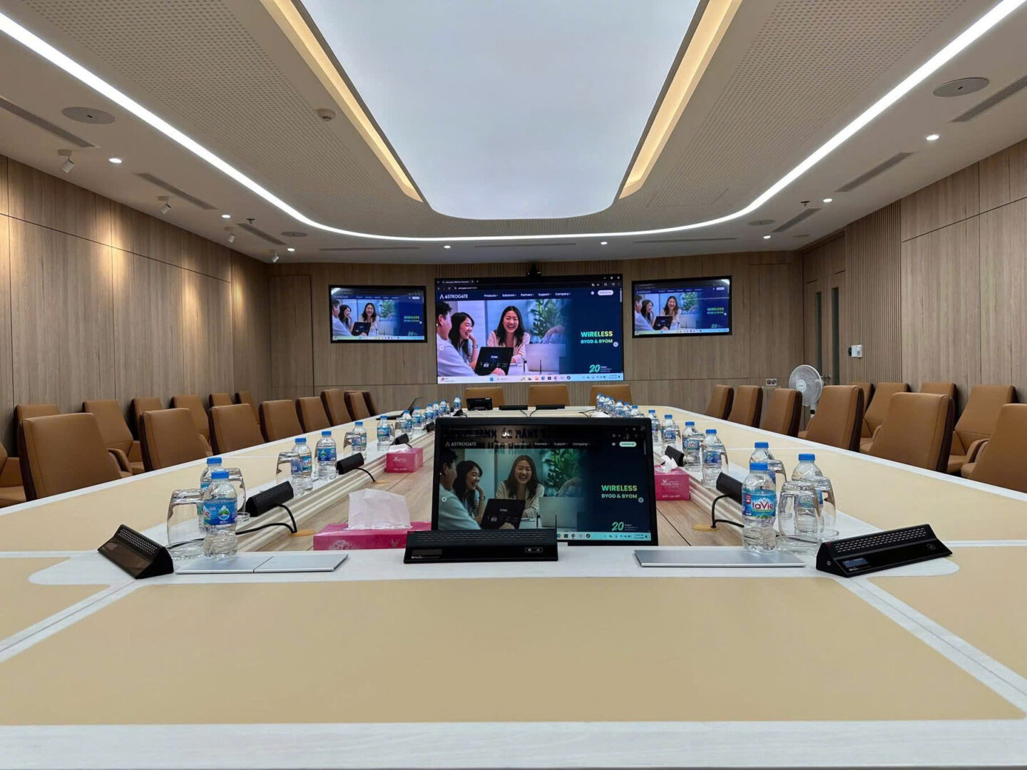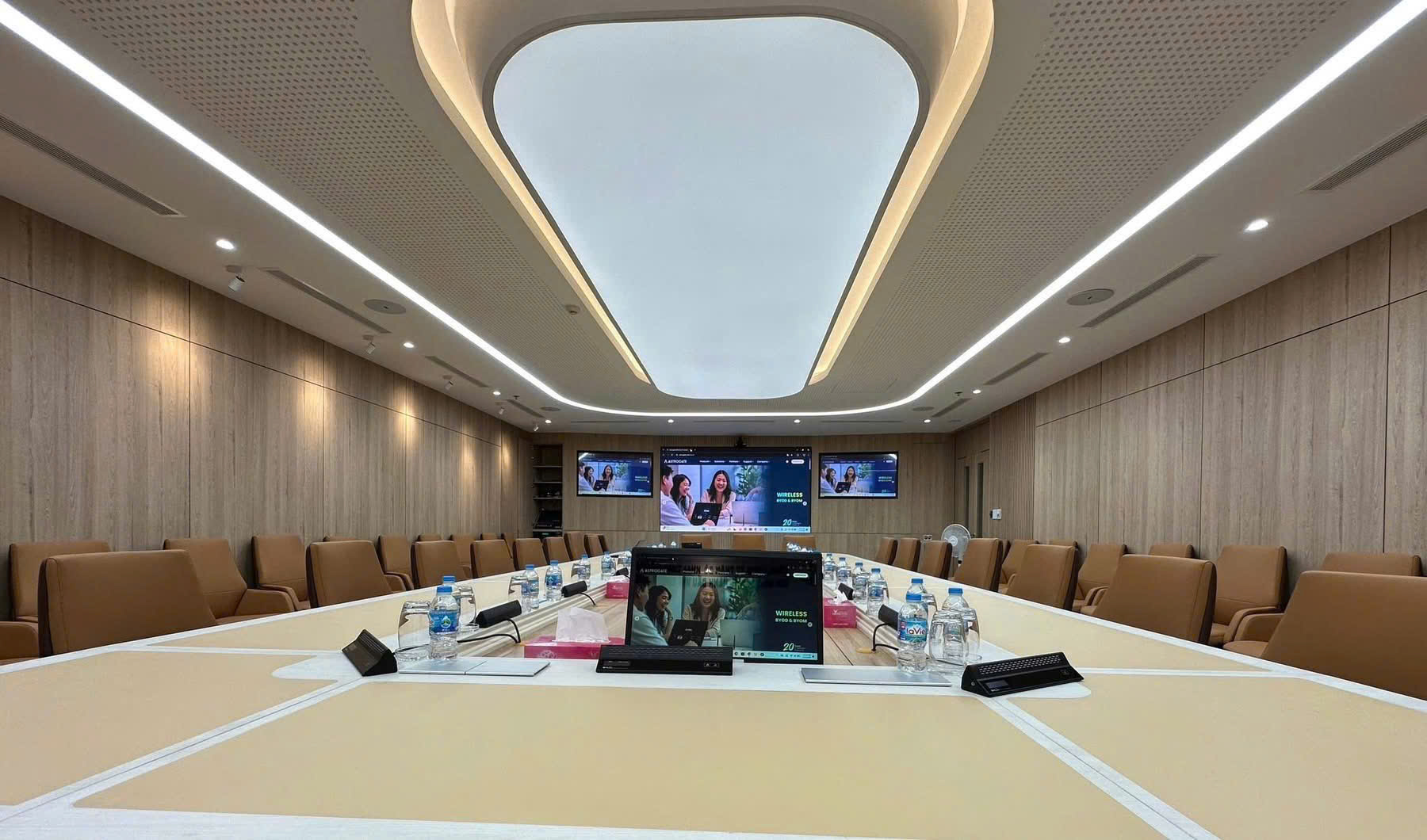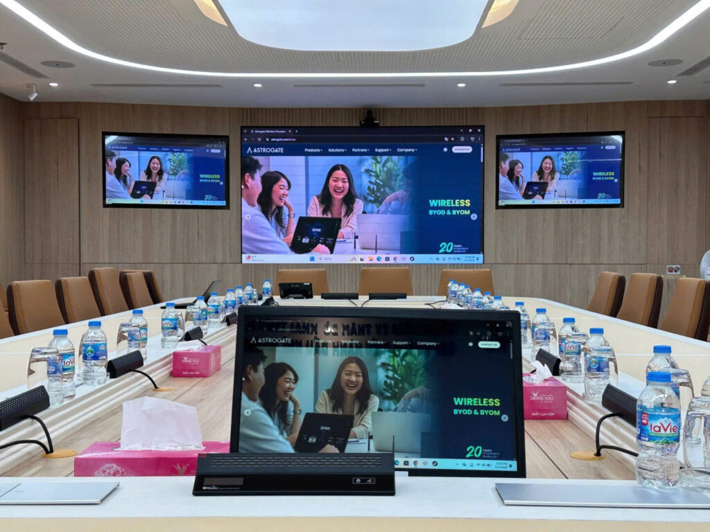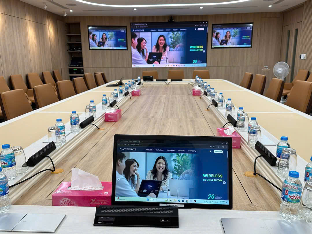 Poly G62 đóng vai trò trung tâm điều khiển phòng họp, cho phép vận hành mượt mà các nền tảng hội nghị trực tuyến phổ biến. Hệ thống audio Huain đảm bảo thu – phát âm thanh chính xác, hạn chế nhiễu và vọng, giúp các cuộc họp diễn ra liền mạch. Bên cạnh đó, thiết bị trình chiếu không dây Astros giúp việc trình bày nội dung trở nên linh hoạt, nhanh chóng, không phụ thuộc vào cáp kết nối.