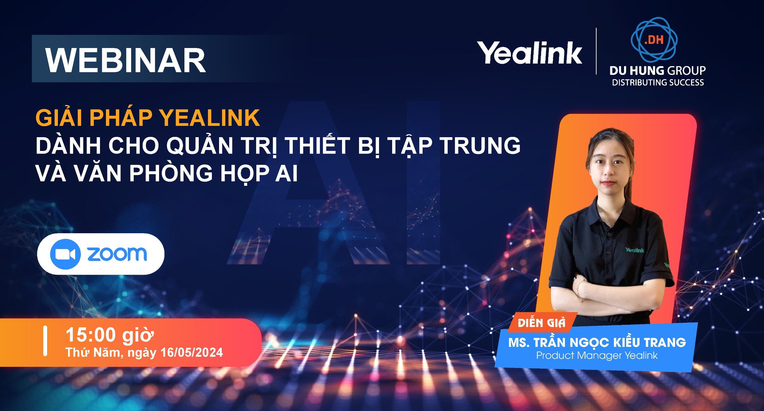 Vào lúc 15h00, thứ năm ngày 16/05/2024, Du Hưng sẽ tổ chức buổi webinar “Giải pháp yealink dành cho quản trị thiết bị tập trung và văn phòng họp AI”, thân mời quý Anh/Chị đại lý, đối tác, khách hàng Du Hưng cùng tham dự. Trong buổi hội thảo lần này, Du Hưng sẽ giới thiệu đến mọi người về các giải pháp thiết bị đến từ thương hiệu Yealink sử dụng cho quản trị thiết bị tập trung và văn phòng họp với nhiều tính năng AI thông minh cùng chi phí phải chăng được thiết kế tối ưu cho đại số doanh nghiệp hiện nay.